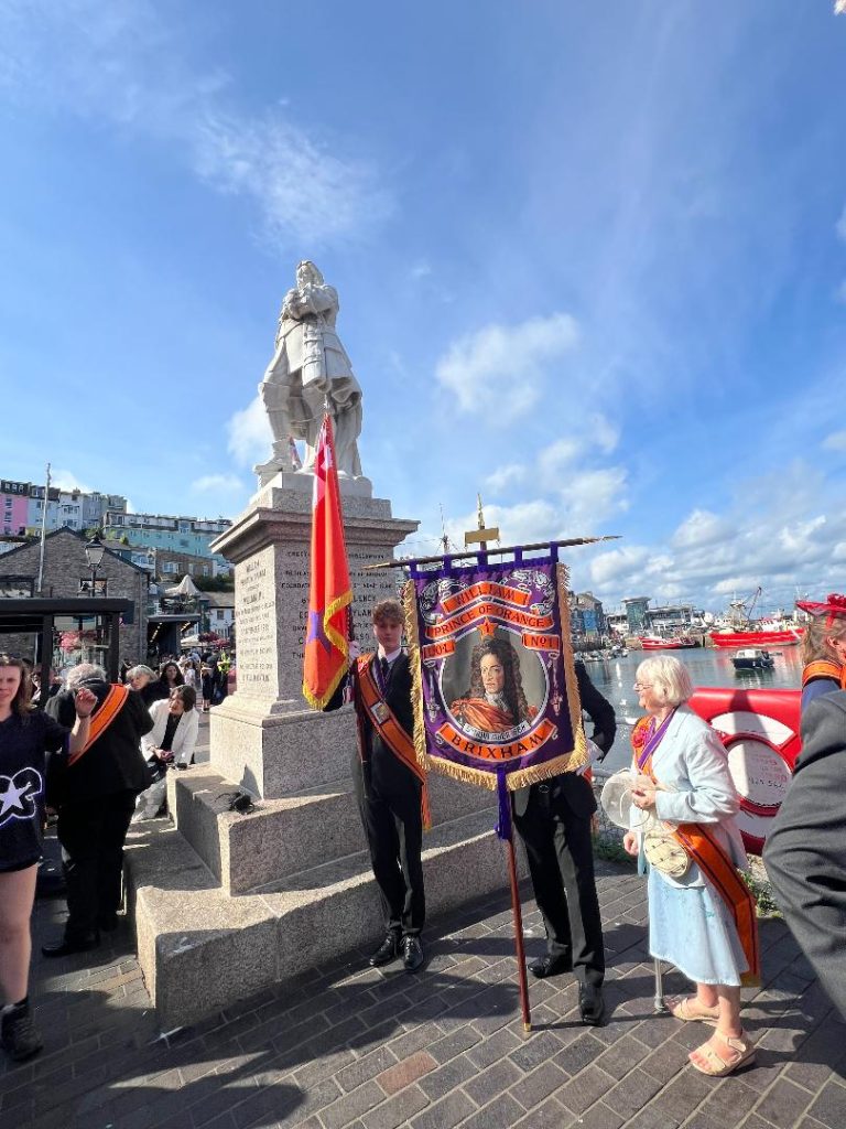 Following the closing ceremony, a parade was held, which paused at All Saints Church, where the Brixham hymn, Abide With Me, was sung. The Rev Henry Francis Lyte was Minister of All Saints when he wrote the famous hymn in 1847. The parade finished with prayer and the National Anthem, at the statue of the Prince of Orange – we were led on parade by Everton District Pipe Band from Liverpool and it was fantastic to hear the sound of the pipes in the old fishing town on that historic day.