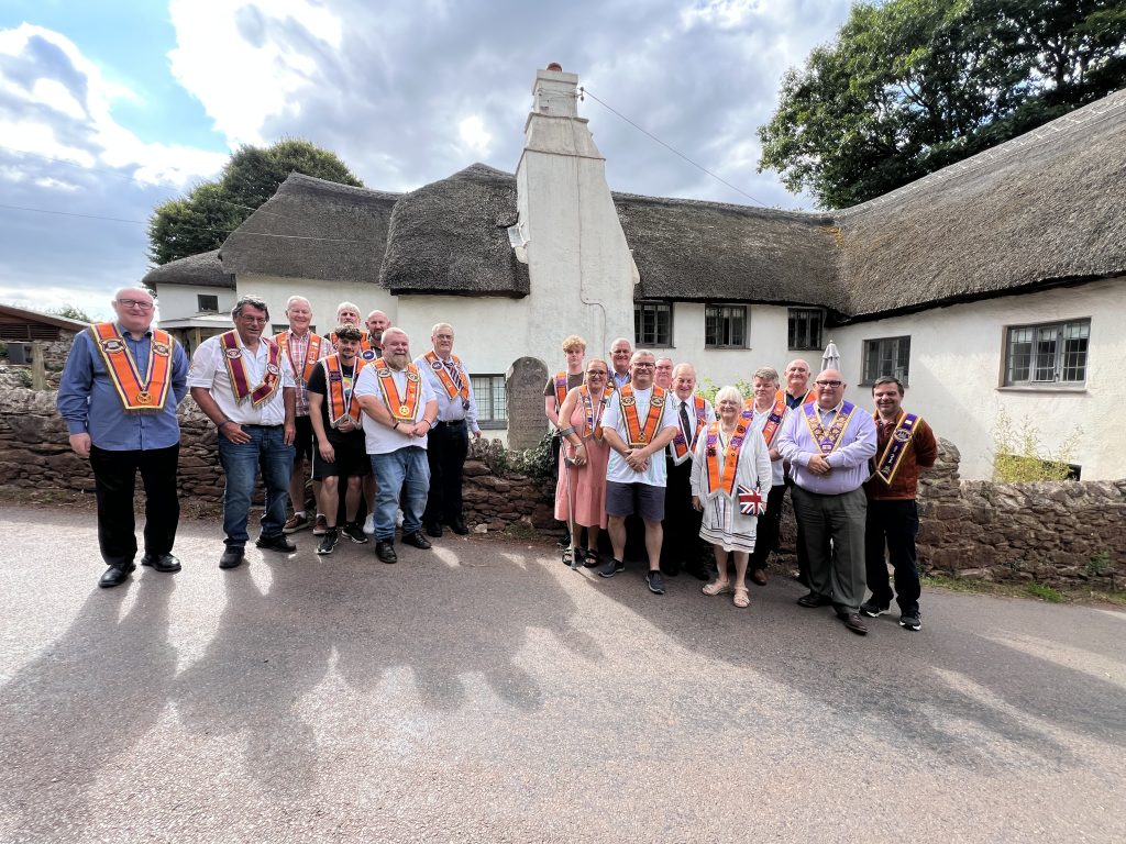 The first weekend in August 2025, was a very special one for some of the members of LOL 803. On the eve of the formation of William Prince of Orange L.O.L. 1, in Brixham, several members of LOL 803 stayed in Parliament Cottage near Totnes. It was here in November 1688, that William Prince of Orange met Sir Edward Seymour and other Gentlemen of the West Country, in what was termed The Prince’s first parliament after departing from Brixham. On the Saturday afternoon, LOL 803 held a meeting in the cottage, with a few invited guests from across the UK, including the Most Worshipful Grand Master of England and Wales Brother Tim Lord HDGM. It was a wonderful experience to meet in the old cottage – the meeting was opened by the singing of that great Welsh hymn, Guide Me Oh Thou Great Jehovah. During the meeting Lodge members read selected extracts from The Prince of Orange Declaration, first published in October 1688, before he set sail from The Netherlands. Afterwards a group photo was taken outside at the garden memorial stone.